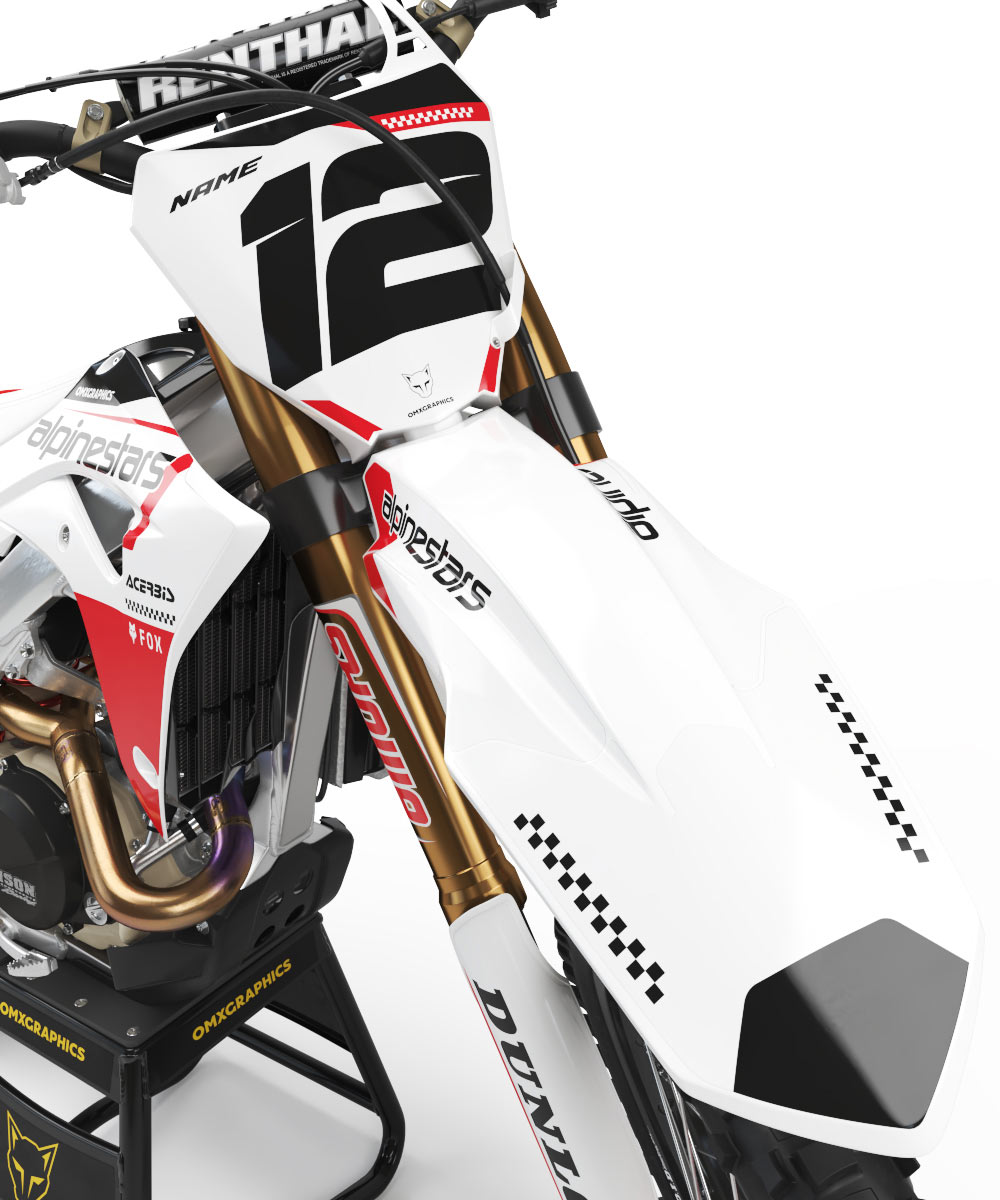 Full motocross graphics kit for Honda by OMXGraphics includes printed graphics for – Tank Shrouds / Fuel Tank, Side Number Plates, Airbox, Rear Fender, Front Fender, Front Number Plate, Fork Guards, and Swingarms (Sometimes kit contents may vary depending on your bike model).
