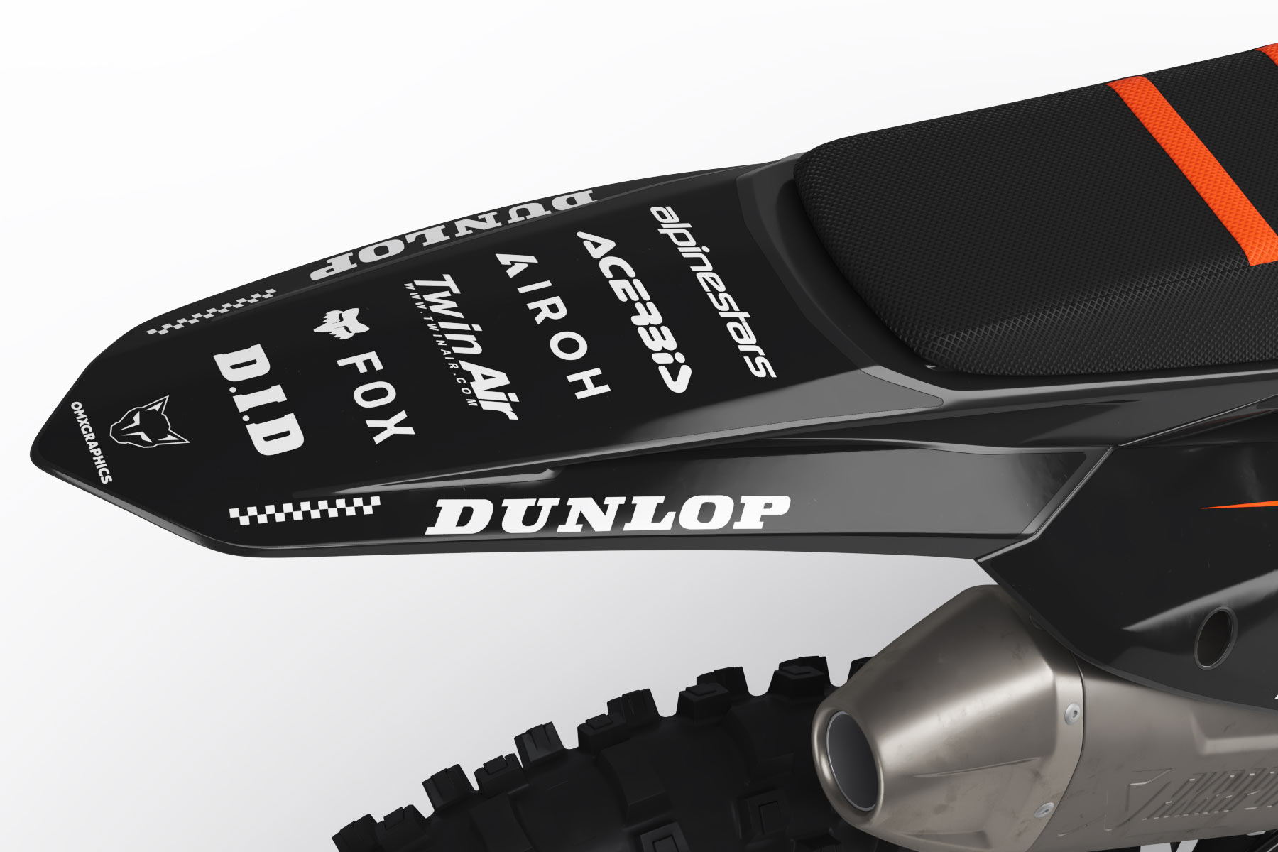 Full motocross graphics kit for KTM by OMXGraphics includes printed graphics for – Tank Shrouds / Fuel Tank, Side Number Plates, Airbox, Rear Fender, Front Fender, Front Number Plate, Fork Guards, and Swingarms (Sometimes kit contents may vary depending on your bike model).
