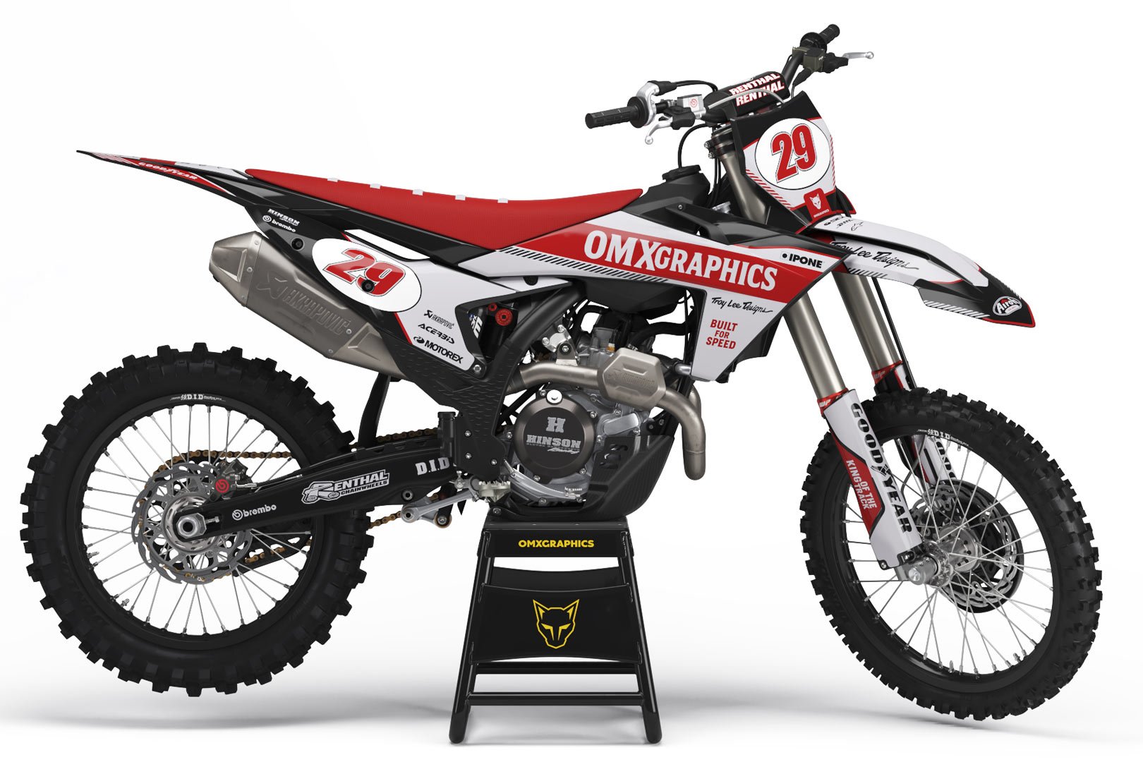 Full motocross graphics kit for KTM by OMXGraphics includes printed graphics for – Tank Shrouds / Fuel Tank, Side Number Plates, Airbox, Rear Fender, Front Fender, Front Number Plate, Fork Guards, and Swingarms (Sometimes kit contents may vary depending on your bike model).